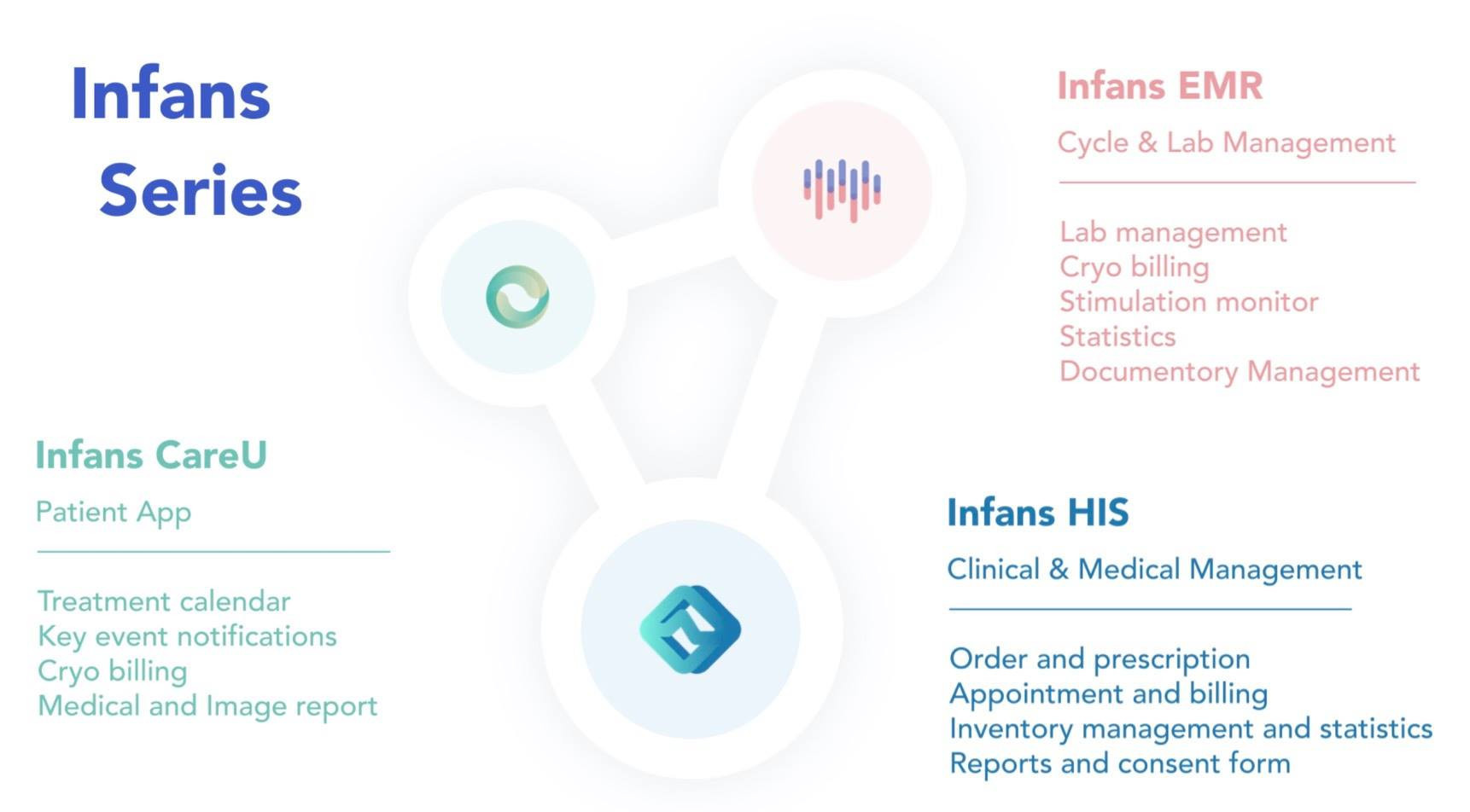 為了為輔助生殖中心的患者提供更智能整合的醫療服務,我們的新產品Infans CMS(HIS)、物聯網(IoT)和人工智能(AI)技術也將在本次年會上展出。
